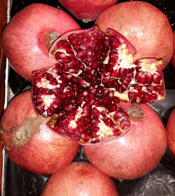 Punica granatumEs ist wieder Granatapfelsaison. Unter der ledrigen Schale verbergen sich die granatroten Samen mit hartem Kern innen und süßsaurem Fruchtfleisch außen. Süßsauer? Nur, wenn man die richtige Frucht erwischt, sonst schmeckt's einfach sauer und die Zunge wird pelzig. Und - zumindest schreibt das im Netz der eine vom anderen ab - Granatäpfel reifen nicht nach, egal, wie lange man sie in der Küche lagert.